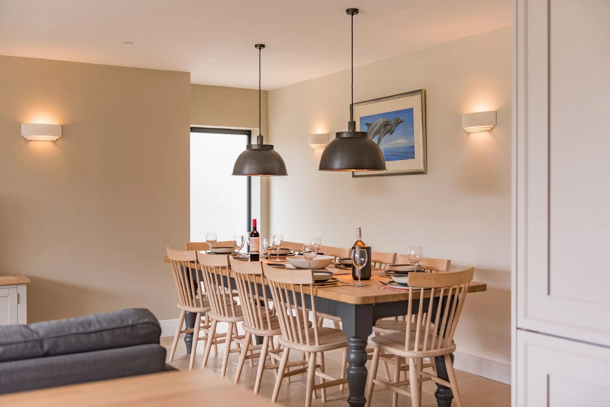The metal clad rear two storey extension creates an open plan living, kitchen and dining space at ground floor, with an additional large entertaining space at first floor with a balcony and views over the dunes to the beach and sea beyond.